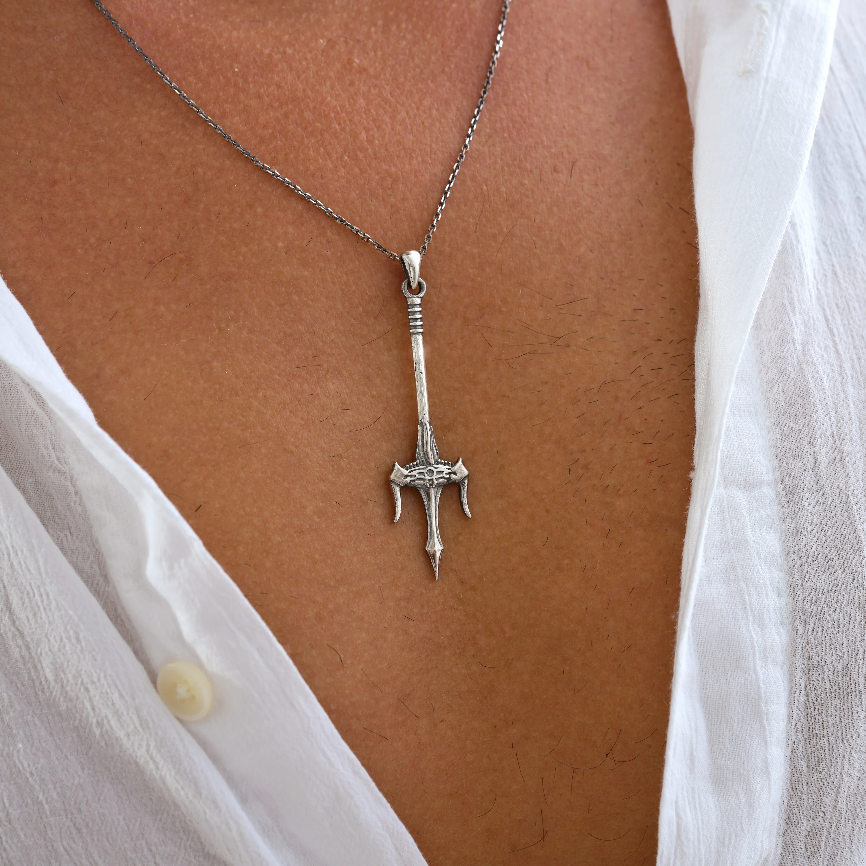 Gücün ve kararlılığın simgesi olan bu trident kolye, detaylı el işçiliğiyle dikkat çeker.