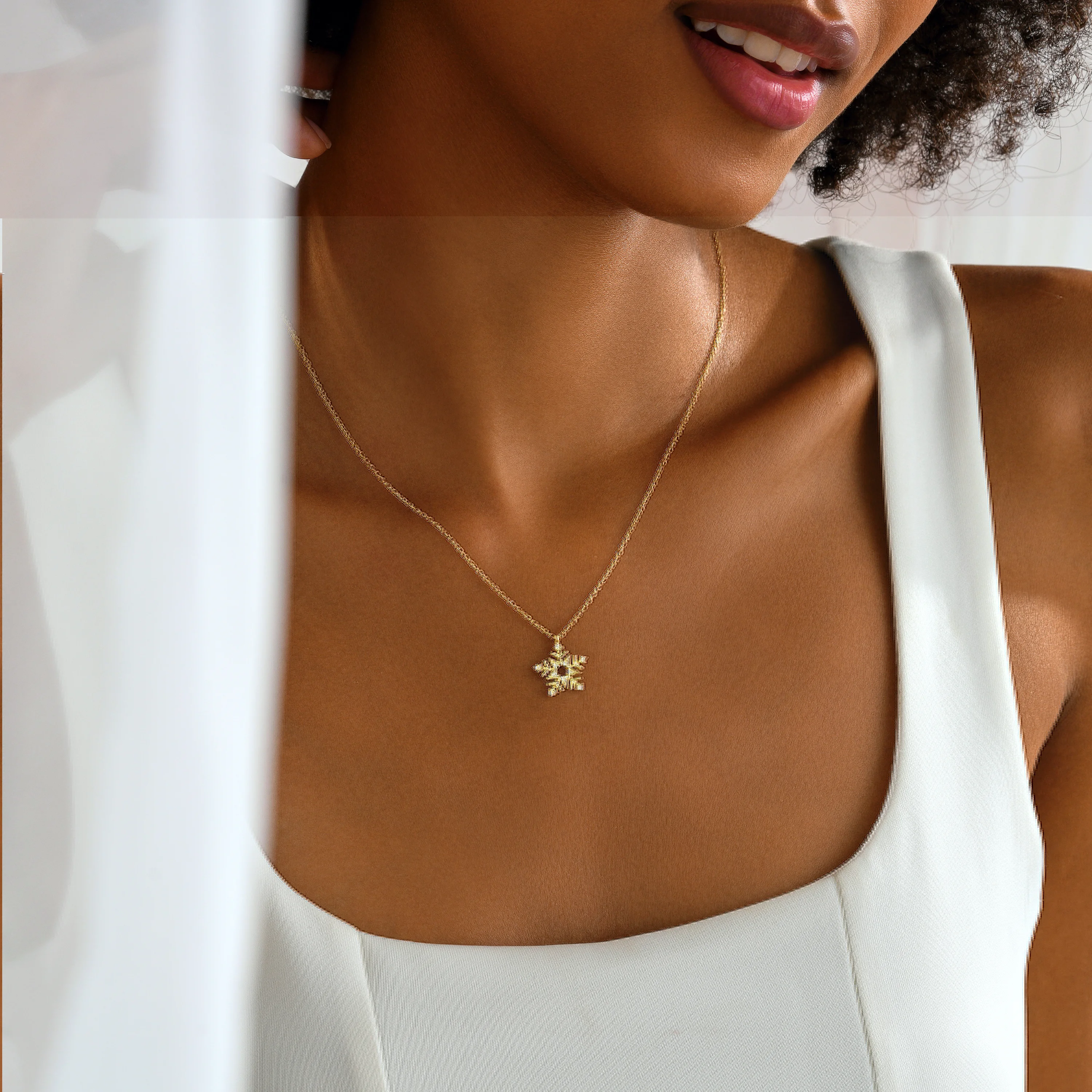 Kışın büyüsünü modern çizgilerle birleştiren bu geometrik kar tanesi kolye, zarafet ve asaleti aynı anda yansıtır.