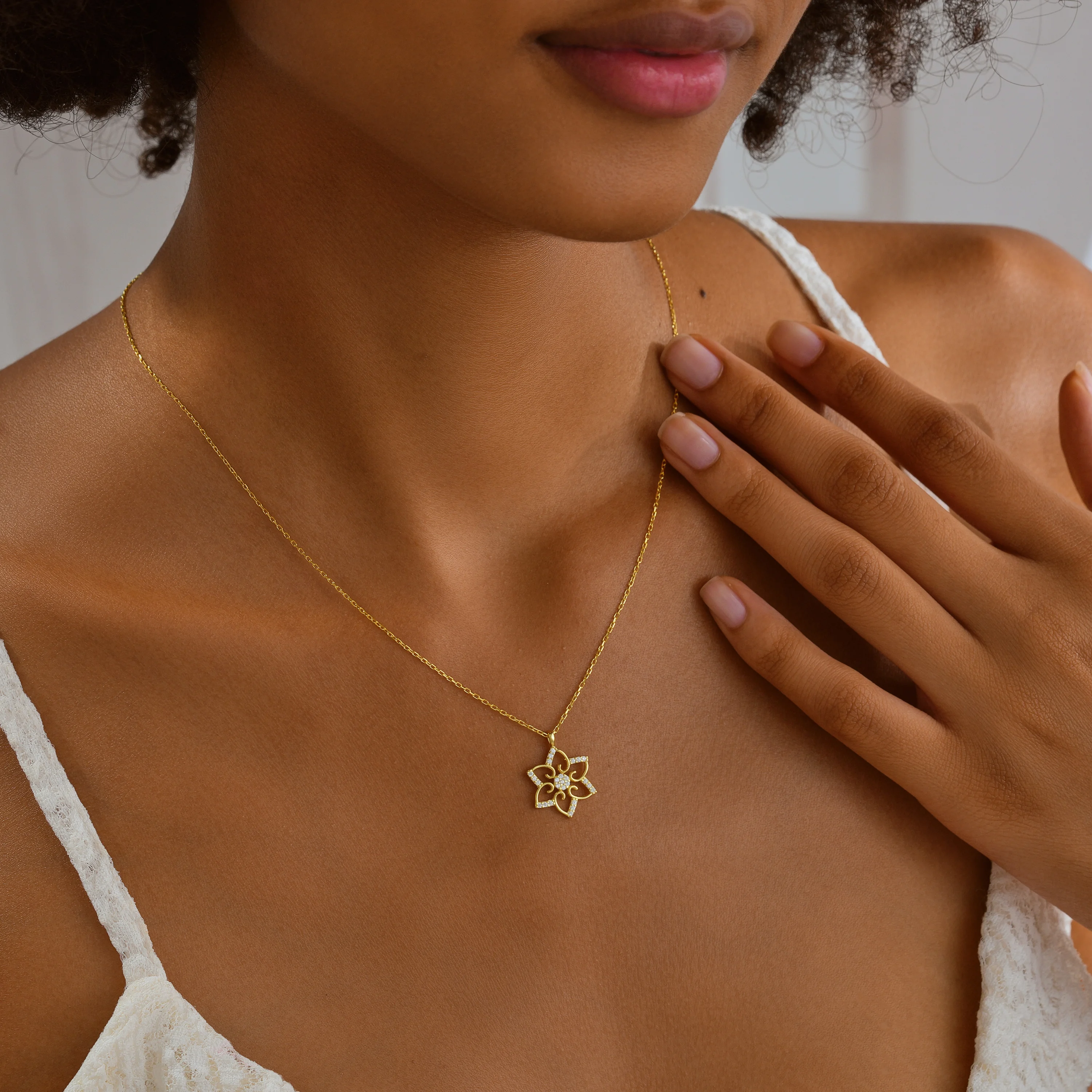 Ortalama ağırlık: 2.20 Gram'dır. Ürünün boyutu: Uzunluk: 1.50 cm'dir. Zincir Uzunluğu: 45 cm’dir. Ürünün tamamı (zincir dahil) gümüştür. Saflık, yeniden doğuş ve içsel dinginliği simgeleyen lotus çiçeğinden ilham alan bu kolye; 925 ayar gümüş işçiliğiyle zarafeti yansıtır. Taş detaylarıyla ışığı zarifçe yansıtan bu model, anlamlı tasarımlardan hoşlananlar için özel bir seçenektir. Kararmalara karşı rodium kaplama da yapılmıştır. Ürünlerimizin tamamı el yapımı olduğu için belirtilen ağırlıkta (+/-) %5 değişiklik olabilir.