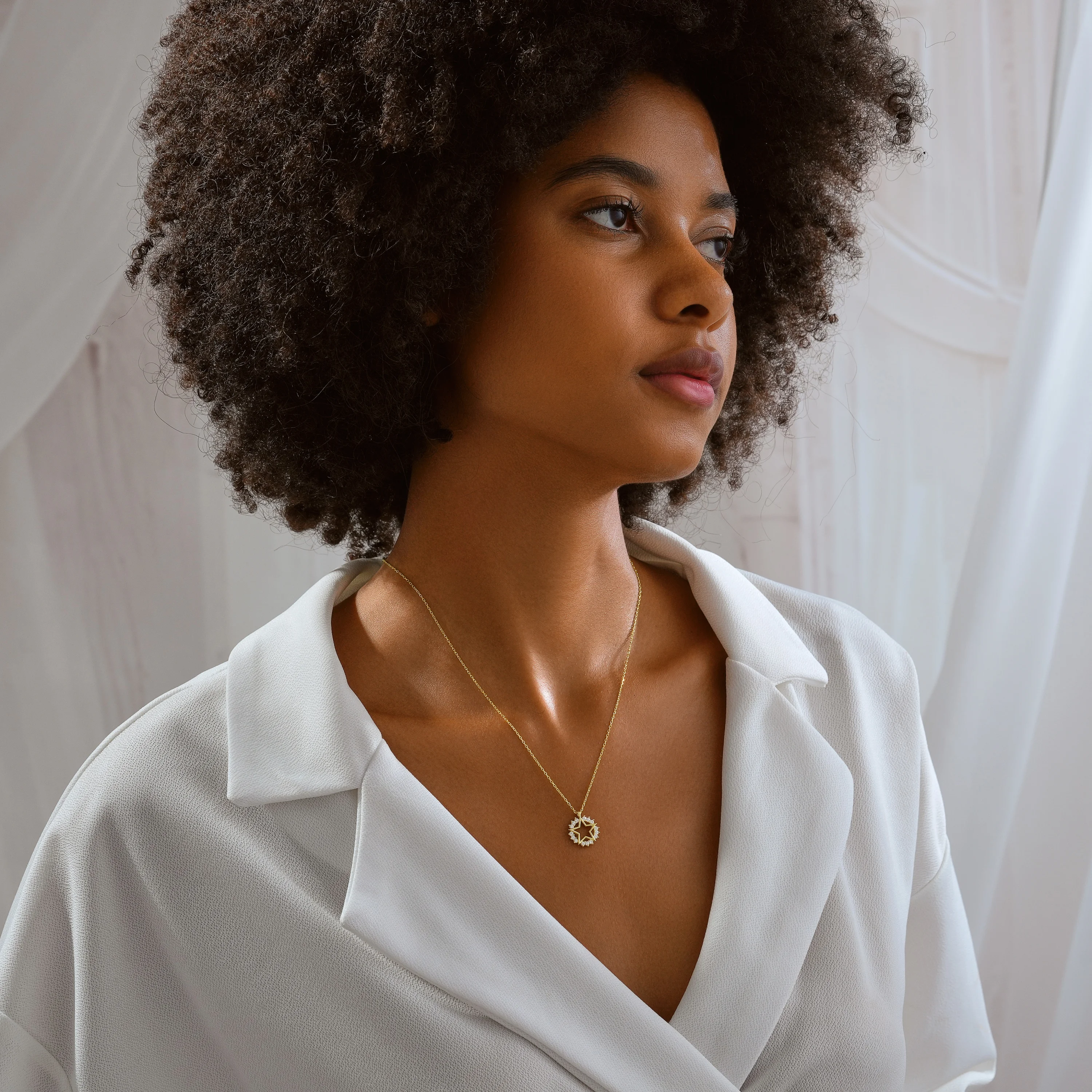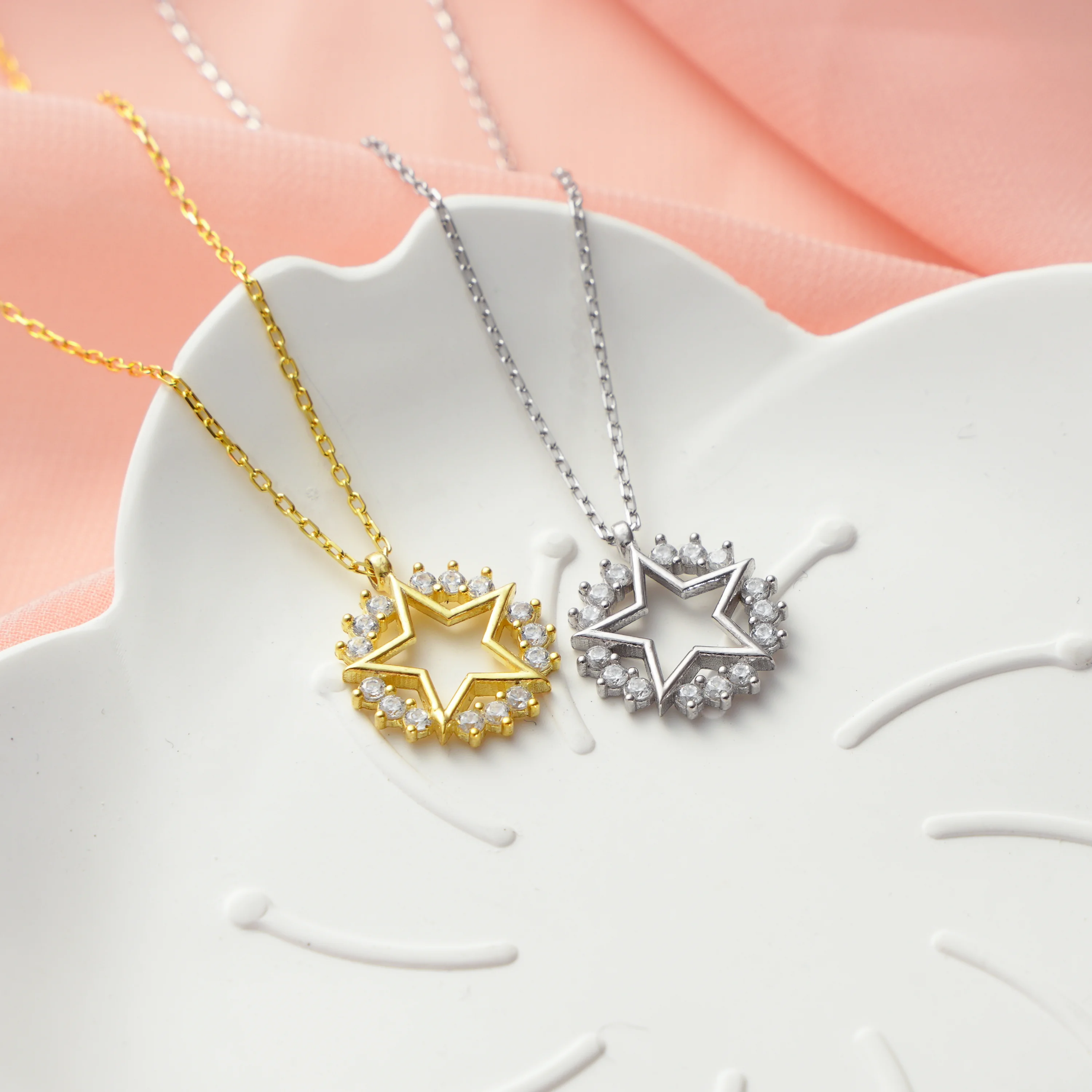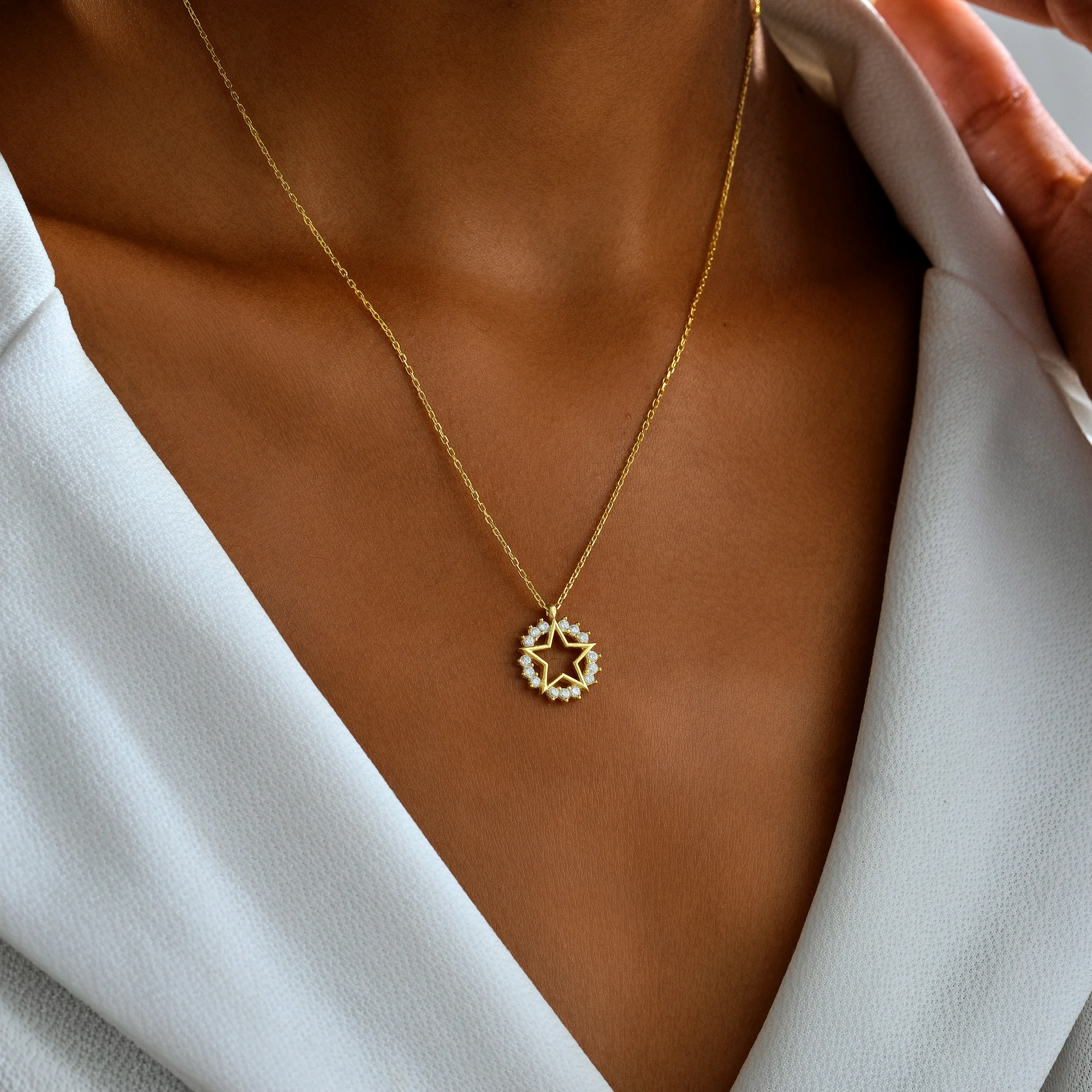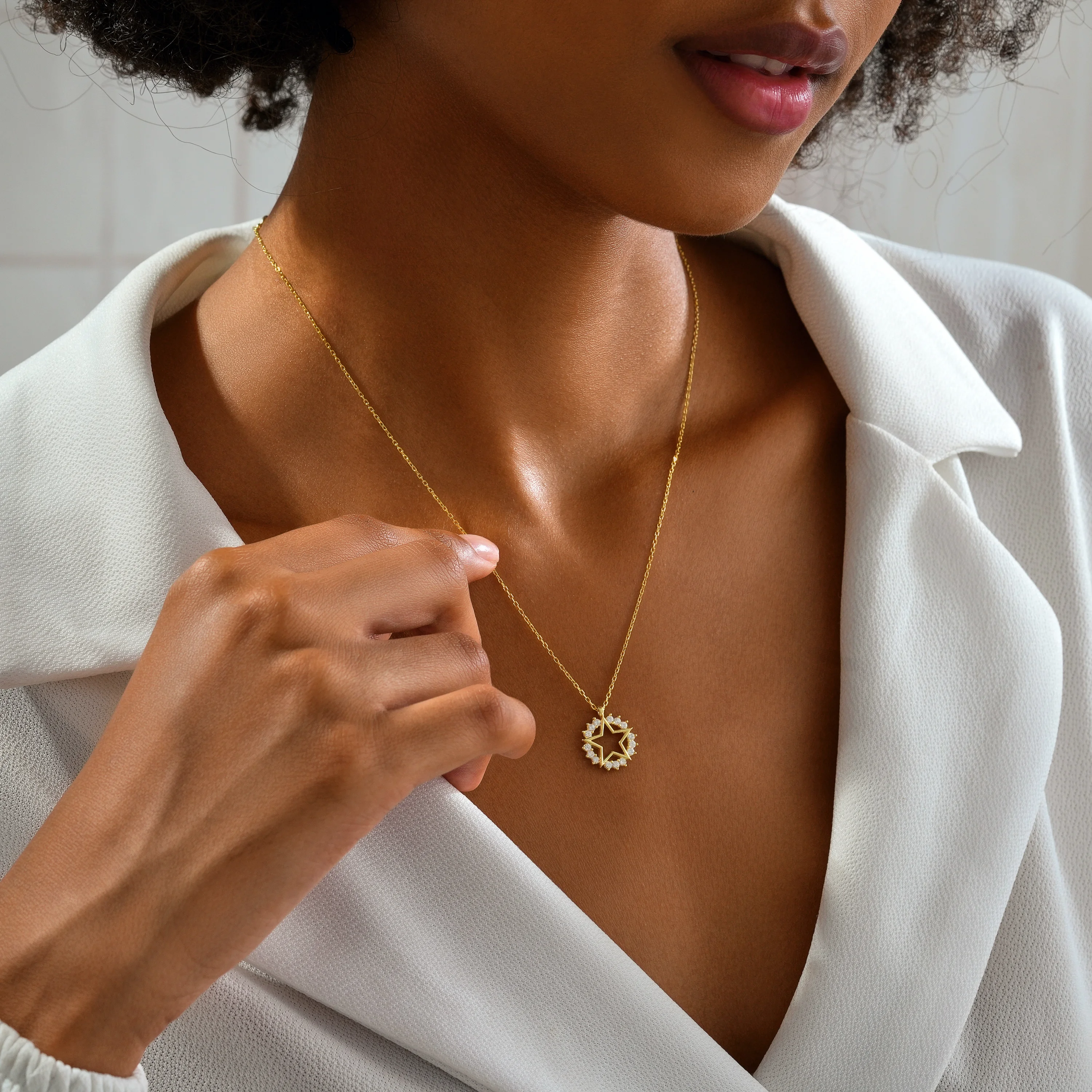 Ortalama ağırlık: 2.10 Gram'dır. Ürünün boyutu: 1.40 cm'dir. Zincir Uzunluğu: 45 cm’dir. Ürünün tamamı (zincir dahil) gümüştür. Gecenin karanlığında parlayan bir yıldızın ışıltısından ilham alındı. Ortası açık beş köşeli yıldız formu, özgürlüğü ve umudu simgelerken etrafındaki taş dizilimi yıldızın enerjisini yansıtır. 925 ayar gümüşten üretilen bu zarif kolye, hem şık bir görünüm hem de güçlü bir sembolik anlam taşır. Kararmalara karşı rodium kaplama da yapılmıştır. Ürünlerimizin tamamı el yapımı olduğu için belirtilen ağırlıkta (+/-) %5 değişiklik olabilir.