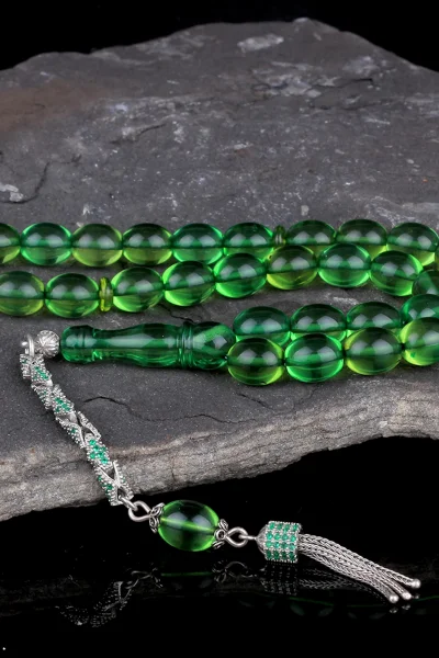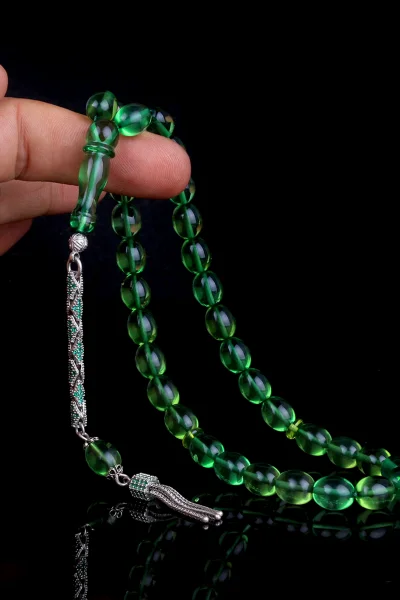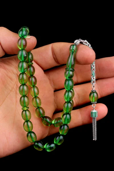 Kapsül Kesim 925 Ayar Gümüş Püsküllü Yeşil Renk Damla Kehribar Tesbih