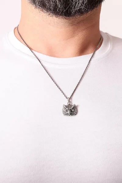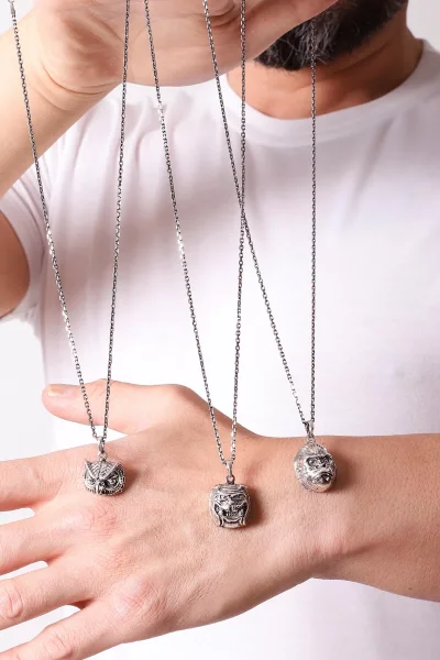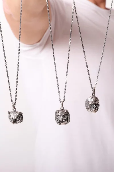 Aynı şekilde, kişisel sembollerin öne çıktığı kolyeler, son yıllarda erkeklerin tarzlarını kişiselleştirme eğilimleri doğrultusunda sıklıkla tercih edilmektedir. Bu tasarımlar, bir yandan maskülen bir duruş sergilerken, diğer yandan anlam yüklü detaylarla tarzınıza derinlik kazandırır. Örneğin, ok, kılıç, kurukafa, aslan, pusula, kartal, baykuş gibi sembollerle zenginleştirilen gümüş kolyeler, yalnızca bir aksesuar değil, aynı zamanda özgürlüğünüzün bir ifadesidir. Bu bağlamda, koleksiyonlarındaki her bir parça bir hikaye anlatır.