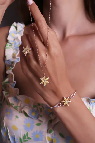 925 Ayar Gümüş Rose Renk Sarı Taşlı Yonca Kadın Set