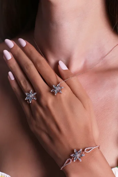 925 Ayar Gümüş Rose Renk Bebek Mavisi Taşlı Yonca Kadın Set