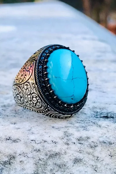925 Ayar Gümüş Damarlı Firuze Taşlı Kalem İşlemeli Usta İşi Erkek Yüzük