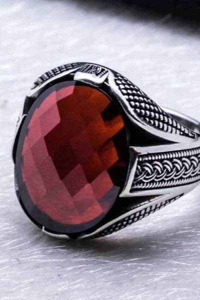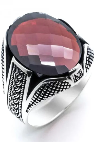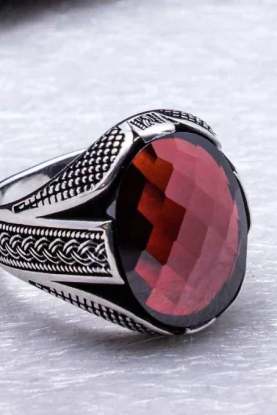 925 Ayar Gümüş Kırmızı Taşlı Örgü Desenli Erkek Yüzük