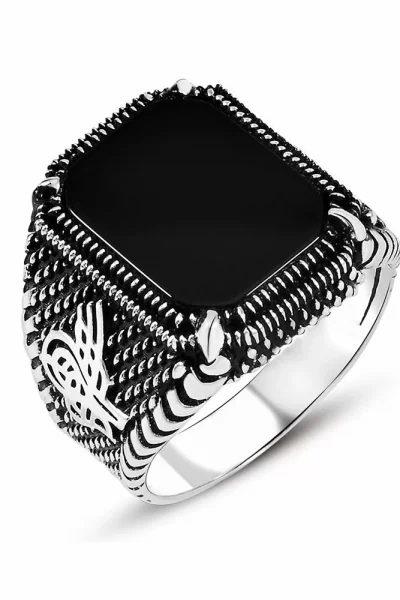 925 Ayar Gümüş Nokta İşlemeli Tuğra Motifli Siyah Onıks Taşlı Erkek Yüzük