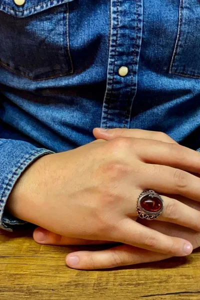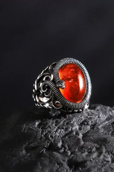 925 Ayar Gümüş Kehribar Taşlı Yılan Motifli Erkek Yüzük