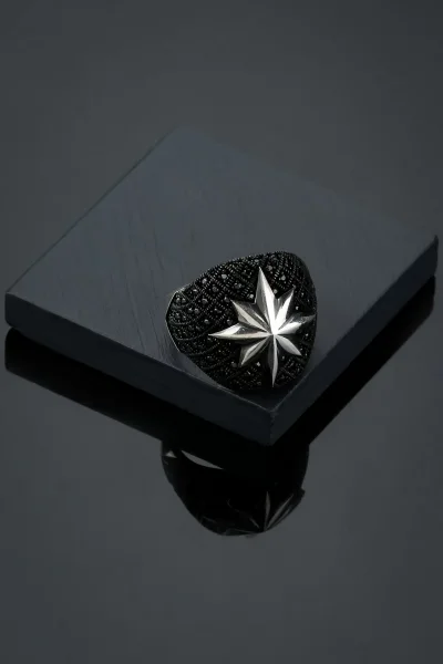 925 Ayar Gümüş Siyah Kuzey Yıldızı Mikro Taş Erkek Yüzük