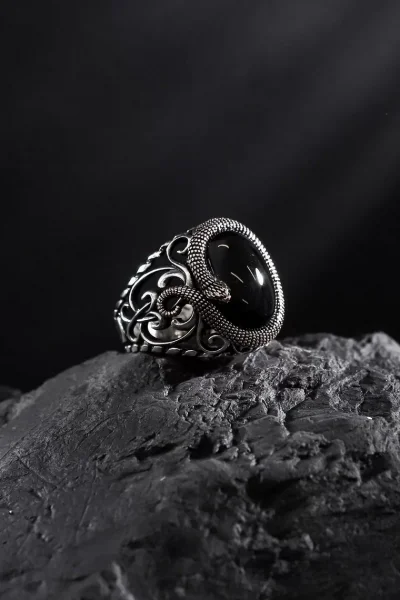 925 Ayar Gümüş Siyah Oniks Taşlı Yılan Motifli Erkek Yüzük