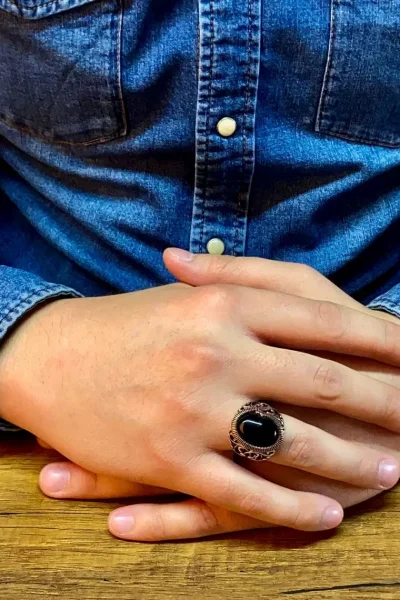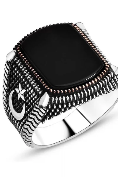 925 Ayar Gümüş Onıks Taşlı Ay Yıldız Detaylı Erkek Yüzük