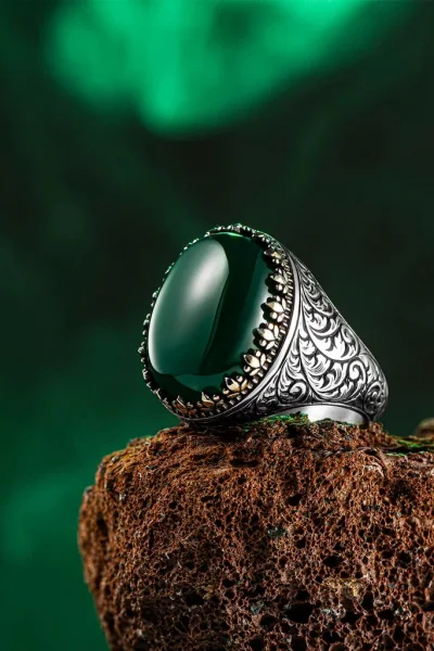 925 Ayar Gümüş Yeşil Akik Osmanlı Desenli Erkek Yüzük