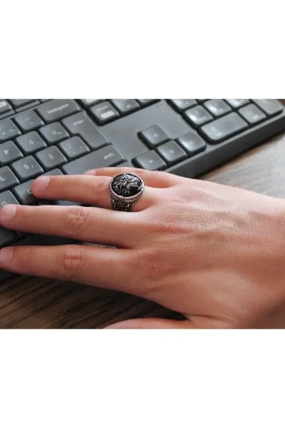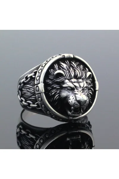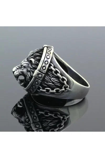 925 Ayar Gümüş Zincir İşlemeli 3 Boyutlu Aslan Kafası Erkek Yüzük