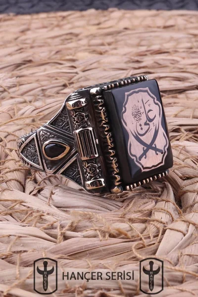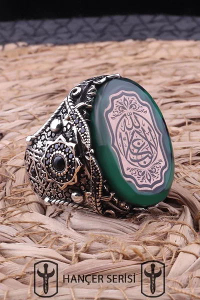 925 Ayar Gümüş Sıkma Kehribar Taşlı Arapça ' Nasihat Olarak Ölmek Yeter ' Yazılı Erkek Yüzük