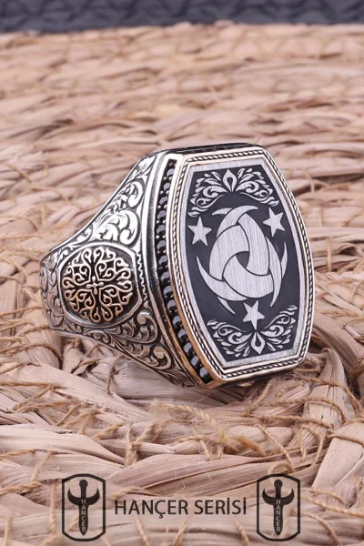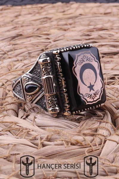 925 Ayar Gümüş Sıkma Kehribar Taşlı Ay Yıldız Desenli Erkek Yüzük