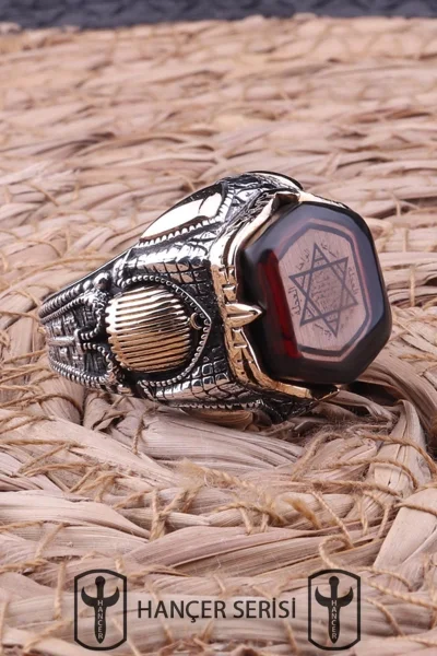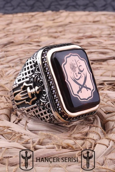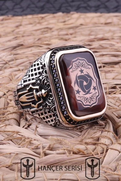 925 Ayar Gümüş Sıkma Kehribar Taşlı Çift Başlı Zülfikar Desenli Erkek Yüzük