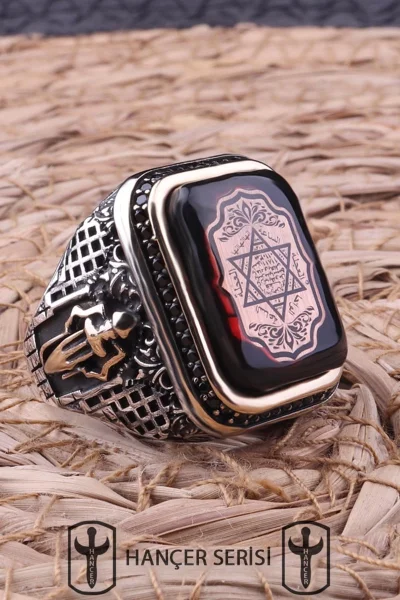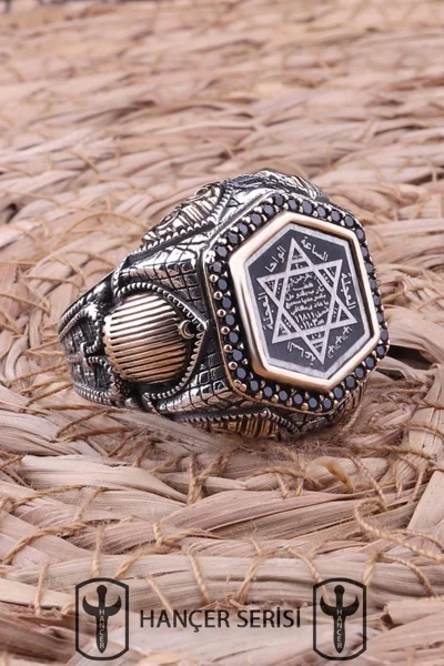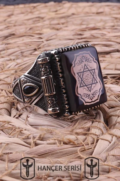 925 Ayar Gümüş Sıkma Kehribar Taşlı Mühr-İ Süleyman Desenli Erkek Yüzük