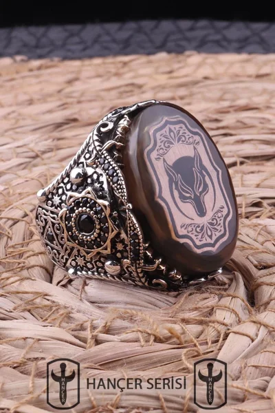 925 Ayar Gümüş Sıkma Kehribar Taşlı Göktürkler'in Devlet Arması Desenli Erkek Yüzük