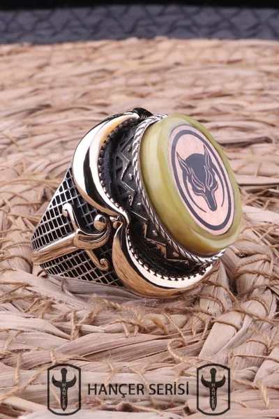 925 Ayar Gümüş Sıkma Kehribar Taşlı Oğuz Kağan Mührü Desenli Erkek Yüzük