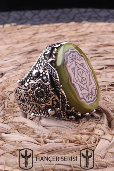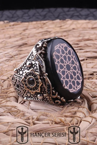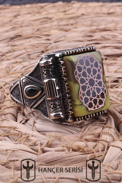 925 Ayar Gümüş Sıkma Kehribar Taşlı Osmanlı Desenli Erkek Yüzük