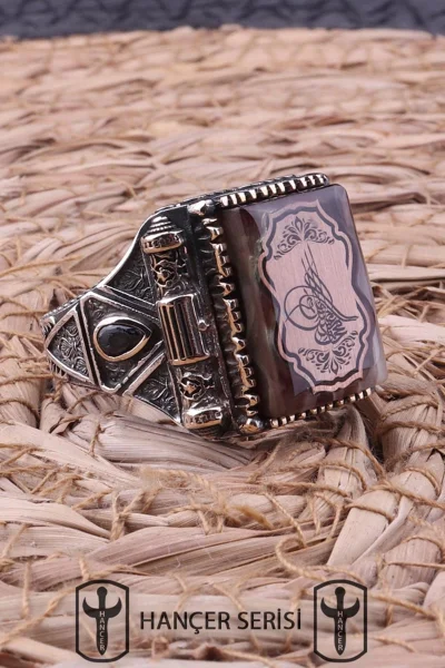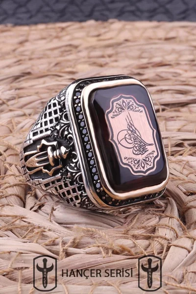 925 Ayar Gümüş Sıkma Kehribar Taşlı Sultan II. Abdülhamid Osmanlı Tuğrası Desenli Erkek Yüzük