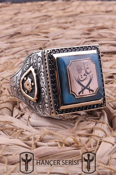 925 Ayar Gümüş Sıkma Kehribar Taşlı Çift Başlı Zülfikar Desenli Erkek Yüzük