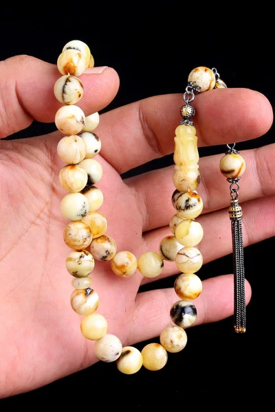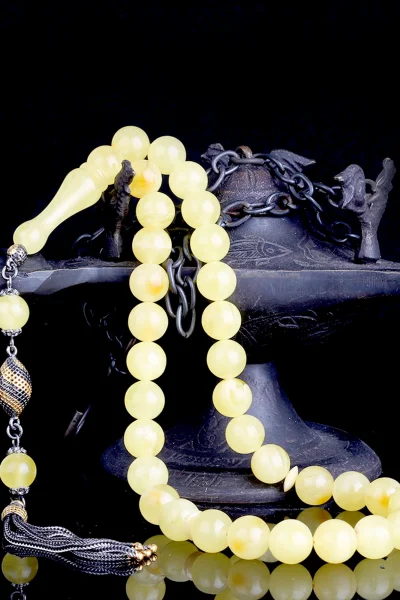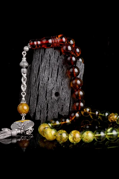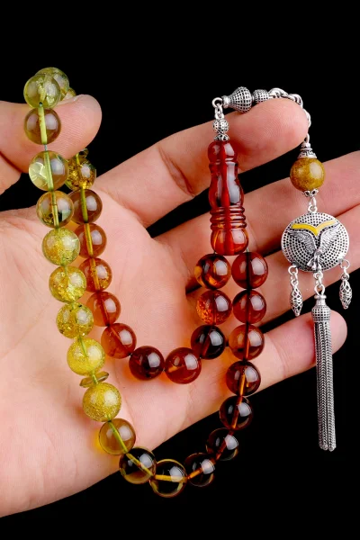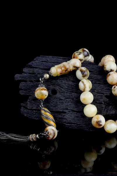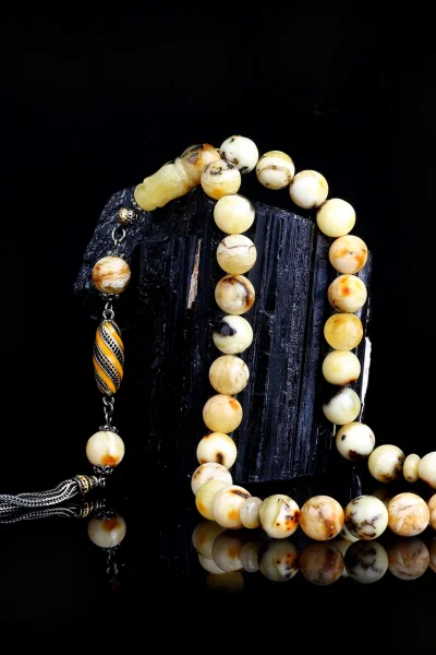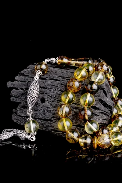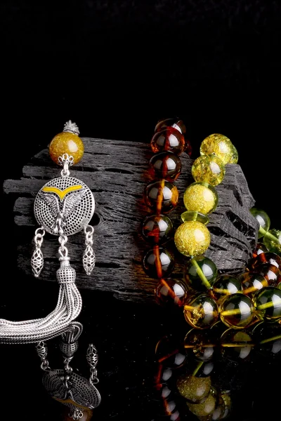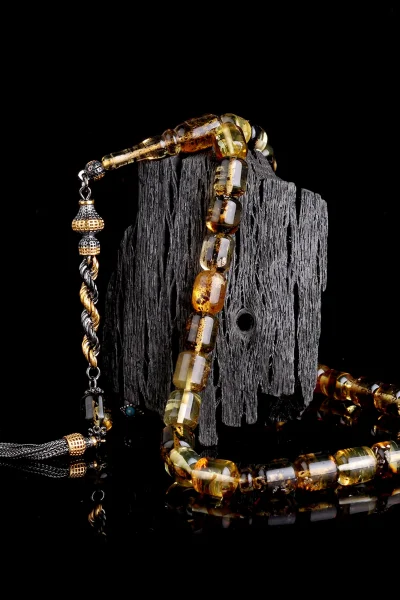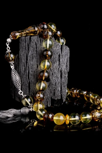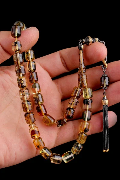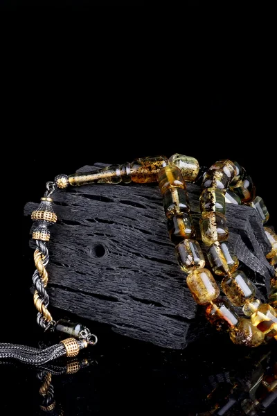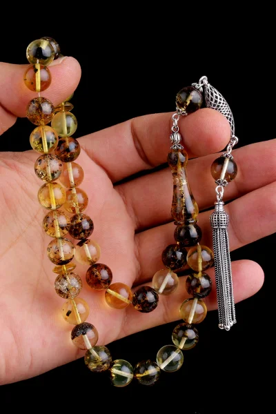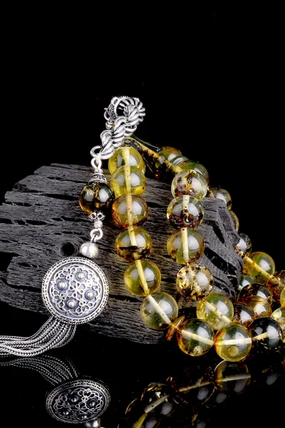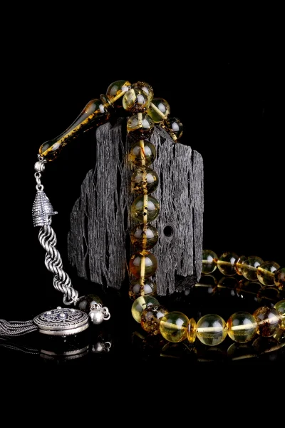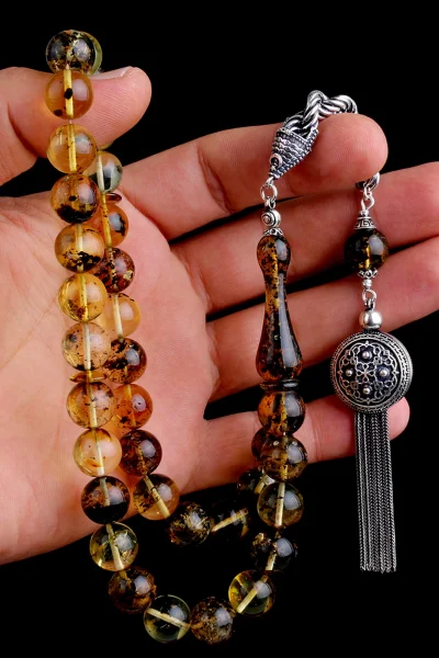 Siyah Zirkon Taşlı Gümüş Püsküllü Fosilli Damla Kehribar Tesbih Hakkında