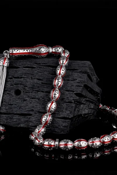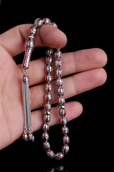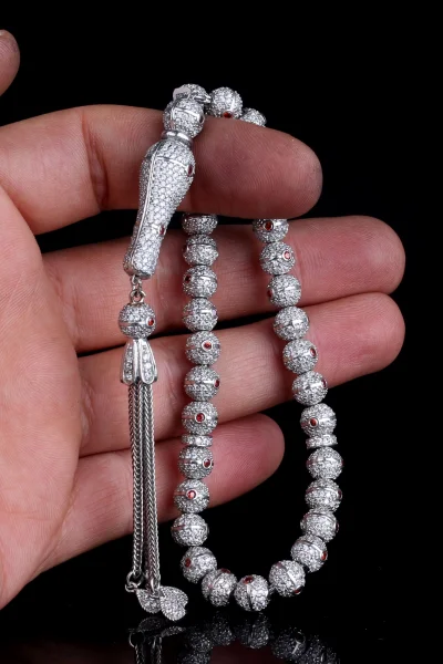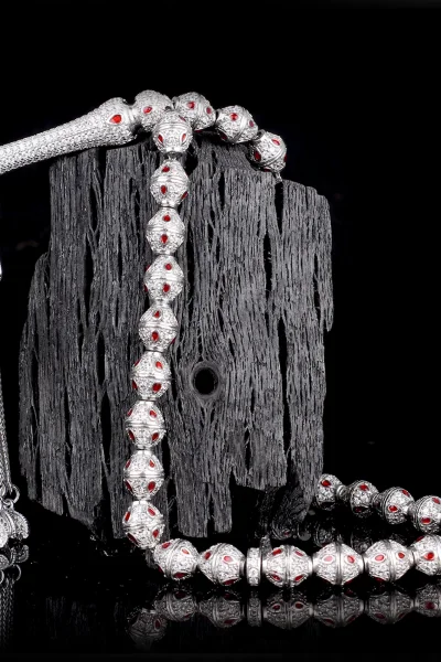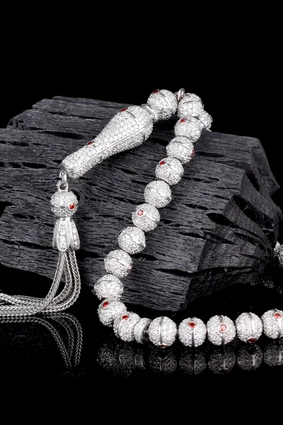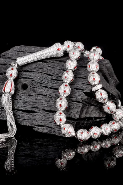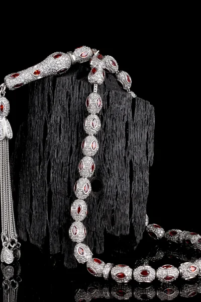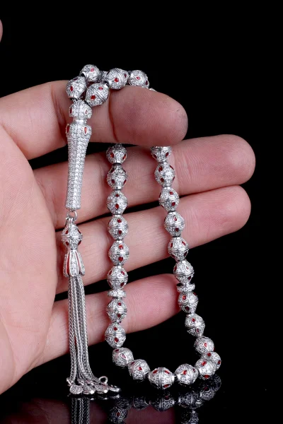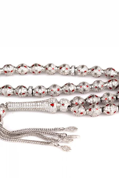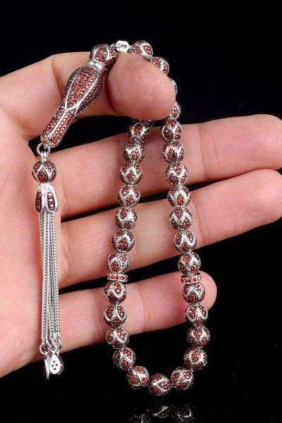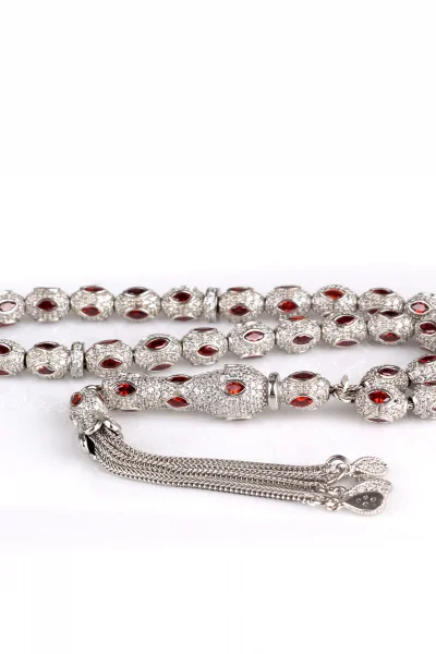 KIRMIZI ZİRKON TAŞ İŞLEMELİ TAMAMI 925 AYAR GÜMÜŞ TESBİH