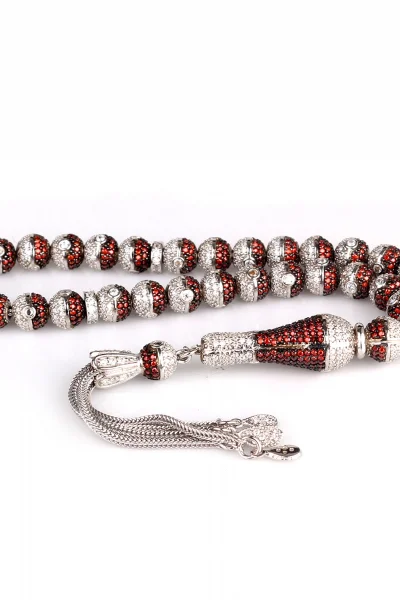 KIRMIZI BEYAZ ZİRKON TAŞ İŞLEMELİ TAMAMI 925 AYAR GÜMÜŞ TESBİH
