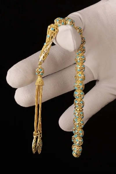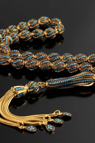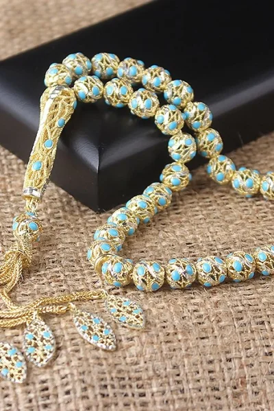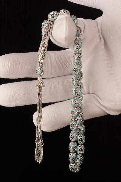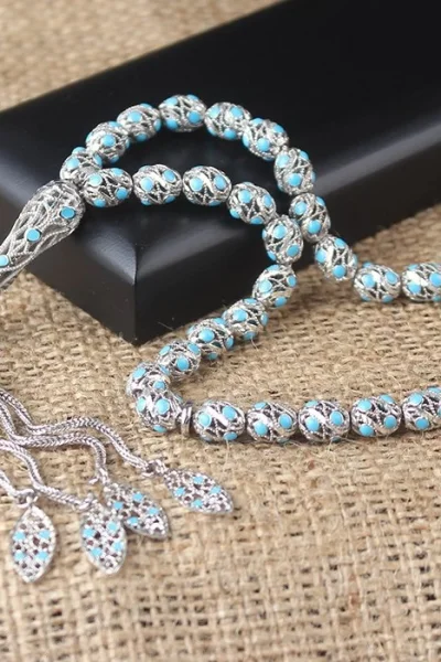 Özel İşçilikli Firuze Taşlı İşlemeli 925 Ayar Gümüş Tesbih