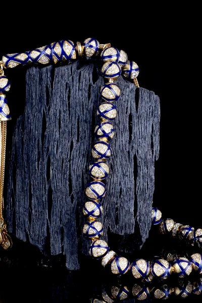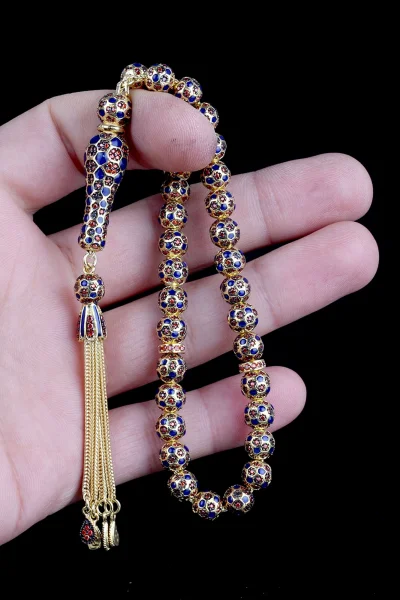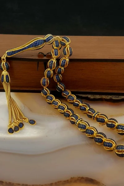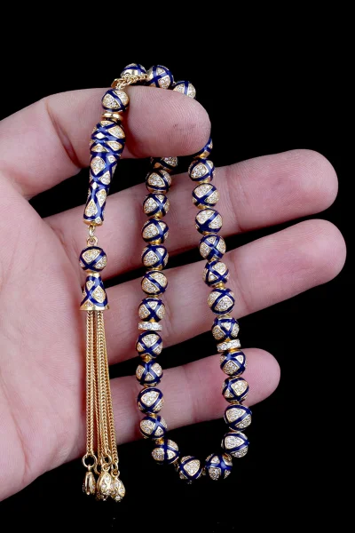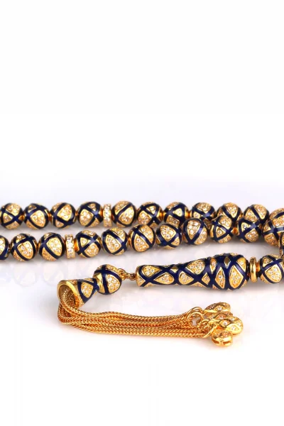 ALTIN KAPLAMALI ZİRKON TAŞLI LACİVERT MİNELİ 925 AYAR GÜMÜŞ TESBİH
