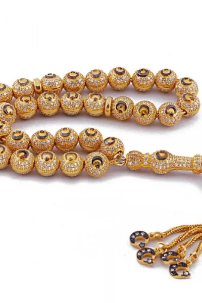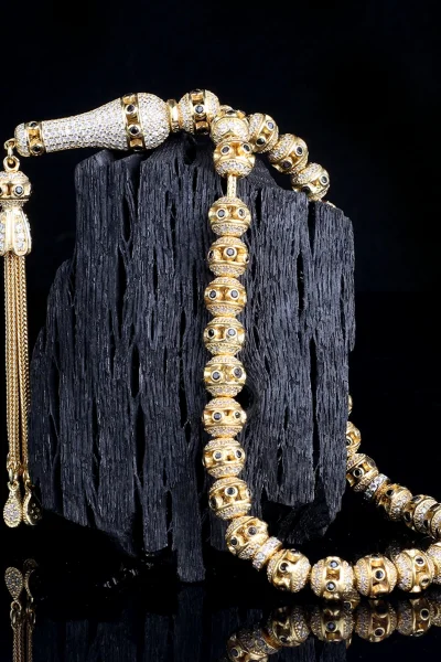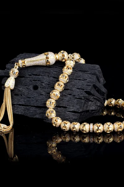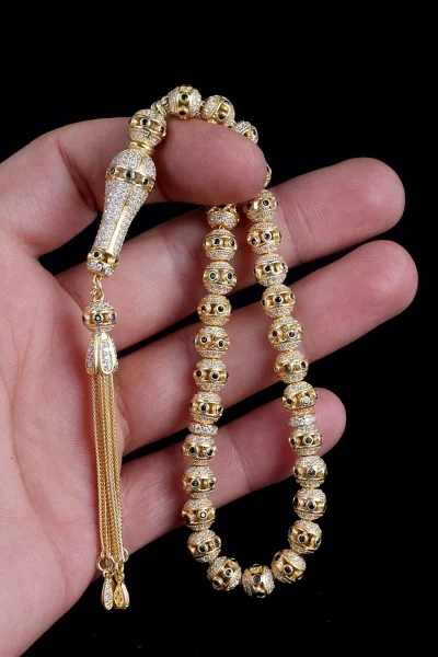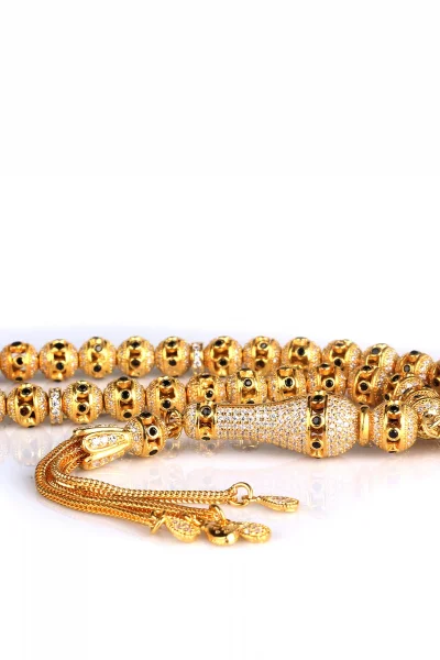 ALTIN KAPLAMALI ZİRKON TAŞ İŞLEMELİ TAMAMI 925 AYAR GÜMÜŞ TESBİH