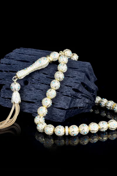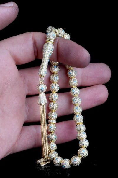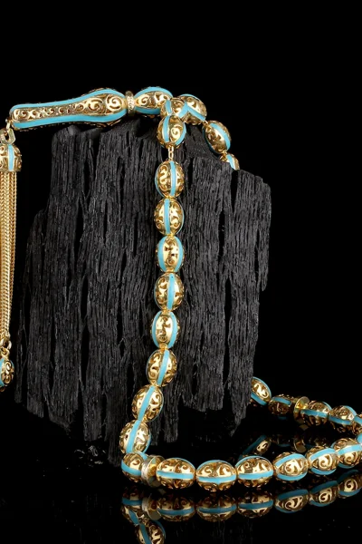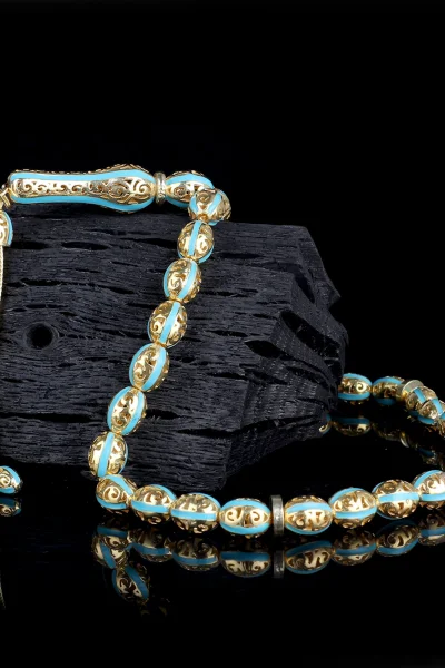 ARPA KESİM ALTIN KAPLAMA TURKUAZ RENK MİNELİ 925 AYAR GÜMÜŞ TESBİH