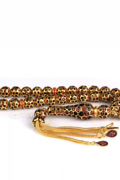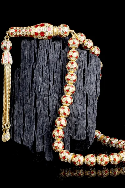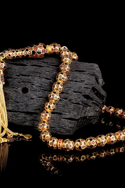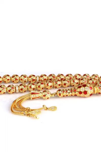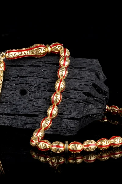 ALTIN KAPLAMALI KIRMIZI MİNELİ 925 AYAR GÜMÜŞ TESBİH