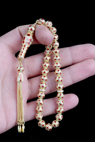 ALTIN KAPLAMALI KIRMIZI TAŞLI 925 AYAR GÜMÜŞ TESBİH