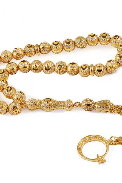 Gümüş Zirkon Taşlı Ay Yıldız Taneli Altın Kaplamalı Tesbih