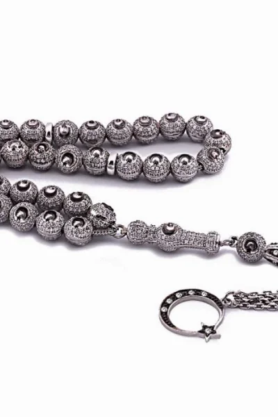Gümüş Zirkon Taşlı Ay Yıldız Tane Püsküllü Tesbih