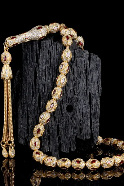 ALTIN KAPLAMA KIRMIZI BEYAZ ZİRKON TAŞLI 925 AYAR GÜMÜŞ TESBİH