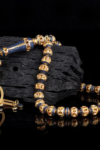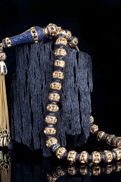 ALTIN KAPLAMA LACİVERT RENK MİNELİ ZİRKON TAŞLI 925 AYAR GÜMÜŞ TESBİH
