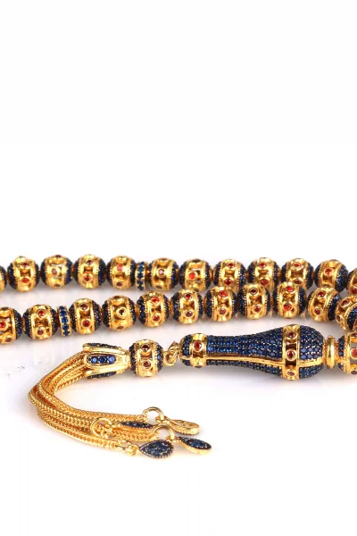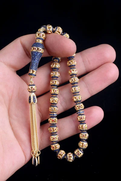 ALTIN KAPLAMA LACİVERT RENK ZİRKON TAŞLI 925 AYAR GÜMÜŞ TESBİH