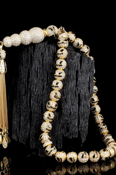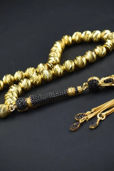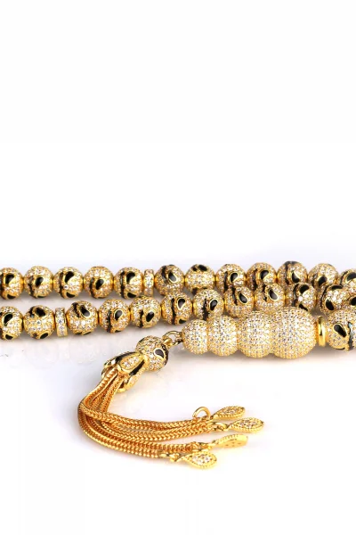 ALTIN KAPLAMA ZİRKON TAŞLI SİYAH MİNELİ 925 AYAR GÜMÜŞ TESBİH