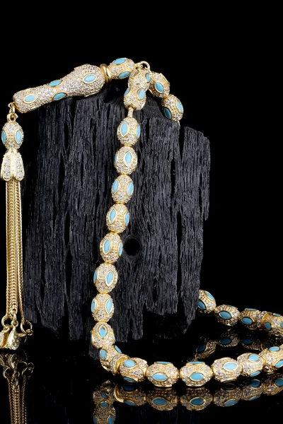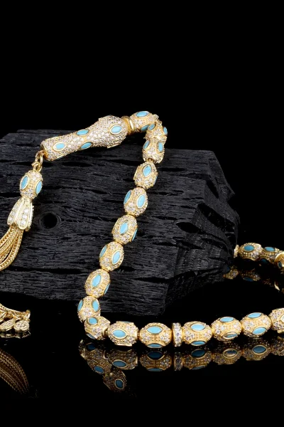 ALTIN KAPLAMALI TURKUAZ MİKRO TAŞLI 925 AYAR GÜMÜŞ TESBİH