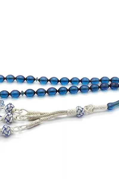 1000 Ayar Kazaz Püsküllü Arpa Kesim Mavi Sıkma Kehribar Tesbih