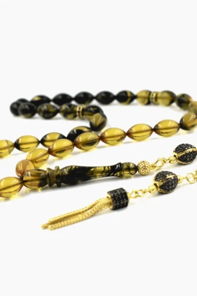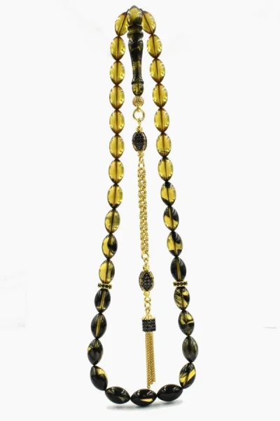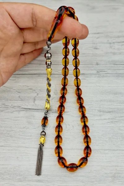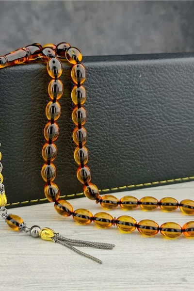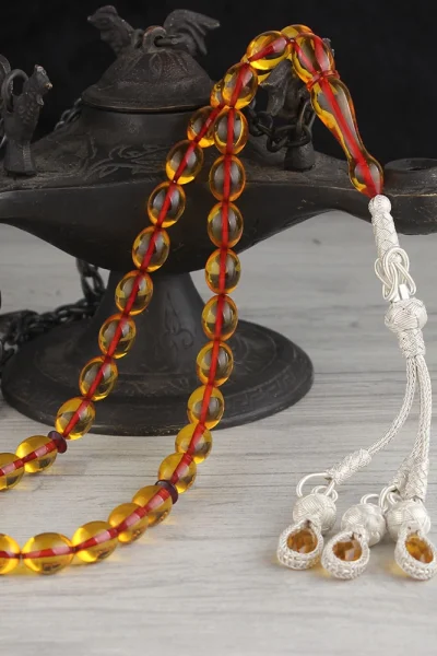 GÜMÜŞ KAZAZ PÜSKÜLLÜ BAL RENGİ SIKMA KEHRİBAR TESBİH