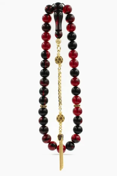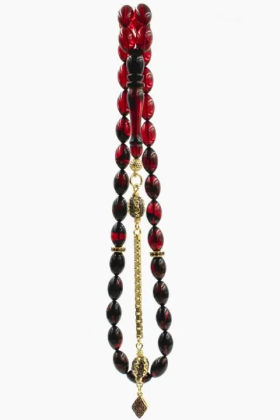 GÜMÜŞ AYYILDIZ PÜSKÜLLÜ KIRMIZI SİYAH SIKMA KEHRİBAR TESBİH