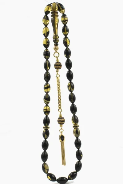 ALTIN KAPLAMALI GÜMÜŞ PÜSKÜLLÜ ATEŞ KEHRİBAR TESBİH