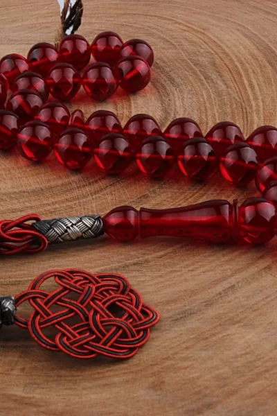 GÜMÜŞ AYYILDIZ PÜSKÜLLÜ KIRMIZI SIKMA KEHRİBAR TESBİH