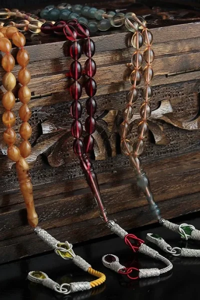 Gümüş Kazaz Püsküllü 3 lü Kehribar Tesbih Seti