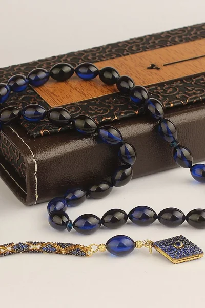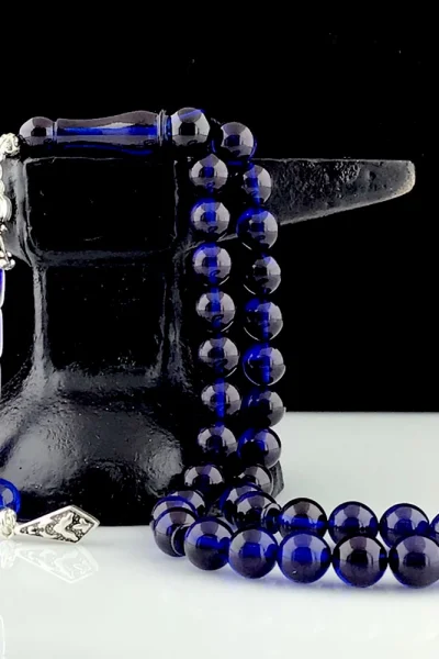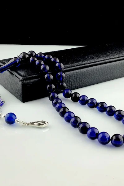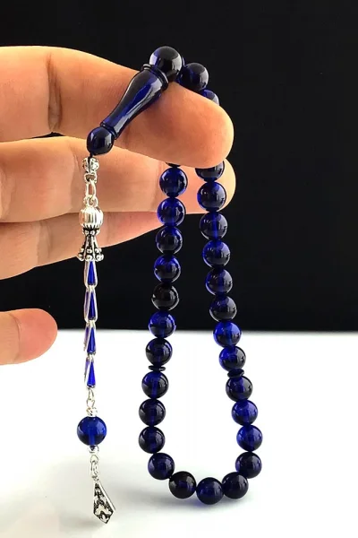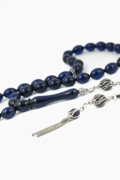 925 AYAR GÜMÜŞ PÜSKÜLLÜ MAVİ SİYAH RENK ATEŞ KEHRİBAR TESBİH