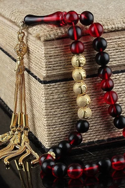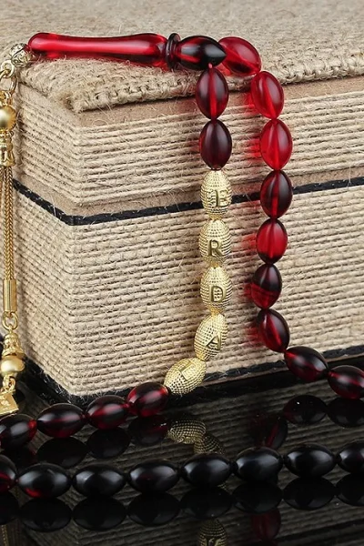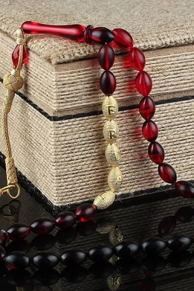 Altın Kaplama Gümüş Kazaz Püskül ve İsim yazılı Ateş Kehribar Tesbih